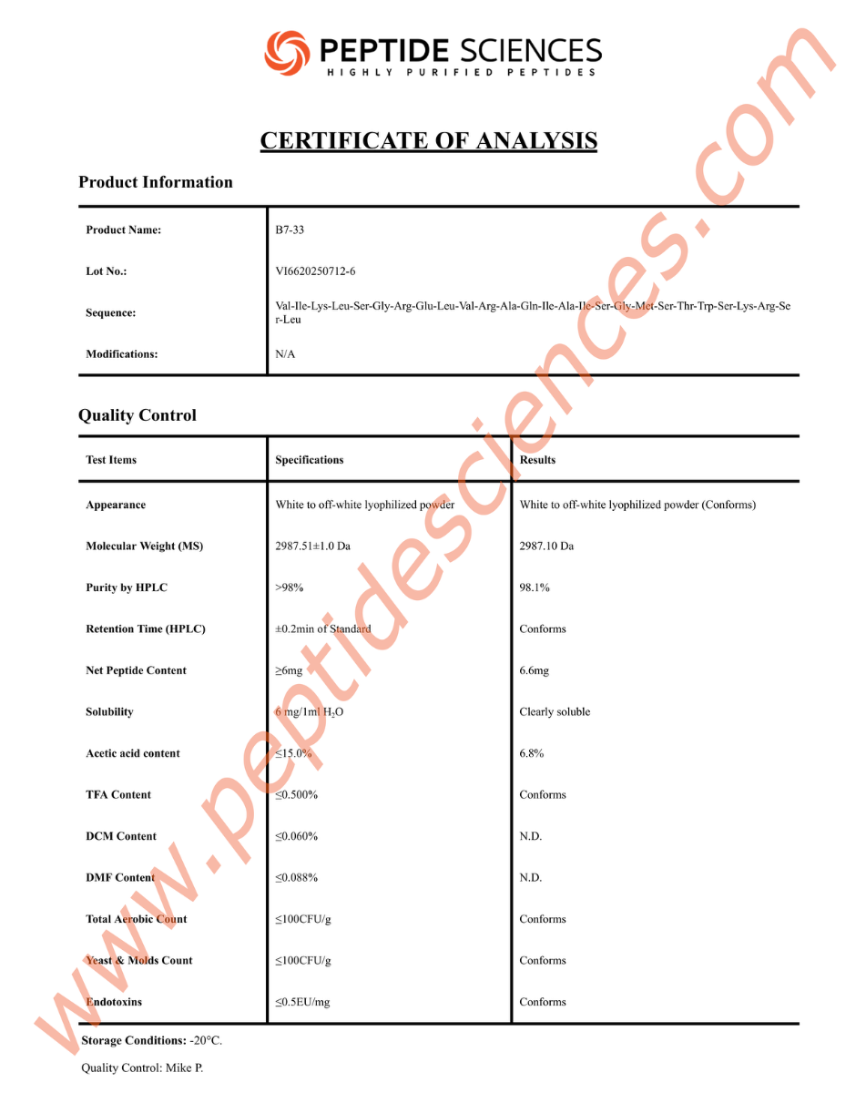 At Peptide Sciences LLC, we implement the most stringent quality control standards in the industry. From the initial synthesis to the final vacuum-sealing process, our B7-33 is monitored for purity and stability. Every batch is subjected to High-Performance Liquid Chromatography (HPLC) and Mass Spectrometry (MS) analysis. This ensures that when you buy B7-33 online, you are receiving a product with a verified sequential fingerprint, exceeding 99% purity and free from any acetate or TFA contaminants.