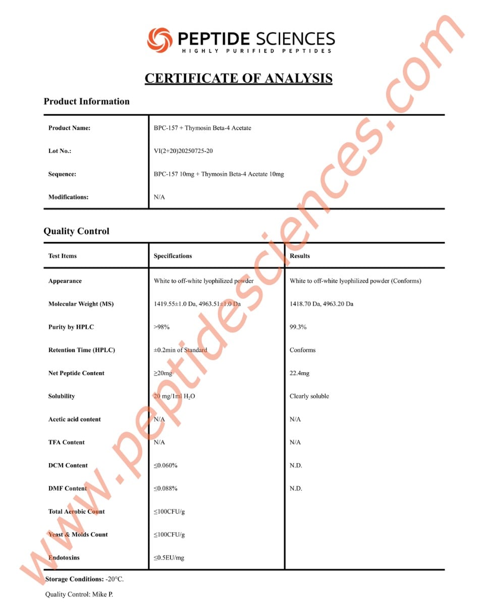 At Peptide Sciences LLC, we implement the most stringent quality control standards in the industry. From the initial synthesis to the final vacuum-sealing process, our BPC-157, TB-500 is monitored for purity and stability. Every batch is subjected to High-Performance Liquid Chromatography (HPLC) and Mass Spectrometry (MS) analysis. This ensures that when you buy BPC-157, TB-500 online, you are receiving a product with a verified sequential fingerprint, exceeding 99% purity and free from any acetate or TFA contaminants.