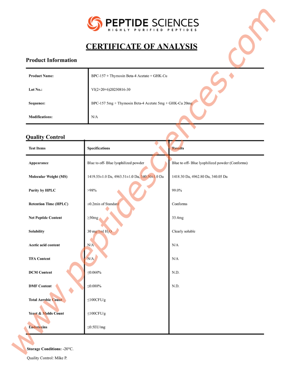 At Peptide Sciences LLC, we implement the most stringent quality control standards in the industry. From the initial synthesis to the final vacuum-sealing process, our BPC-157, TB-500, GHK-Cu is monitored for purity and stability. Every batch is subjected to High-Performance Liquid Chromatography (HPLC) and Mass Spectrometry (MS) analysis. This ensures that when you buy BPC-157, TB-500, GHK-Cu online, you are receiving a product with a verified sequential fingerprint, exceeding 99% purity and free from any acetate or TFA contaminants.